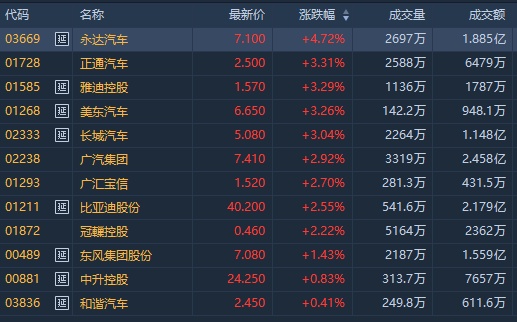 智通财经APP获悉,商务部称正在调研汽车企业,将适时出台措施支持汽车行业。汽车板块集体走强。截至发稿,永达汽车(03669)涨4.72%,报7.1港元;正通汽车(01728)涨3.72%,报2.51港元;广汽集团(02238)涨3.47%,报7.45港元;吉利汽车(00175)涨3.29%,报12.56港元。
