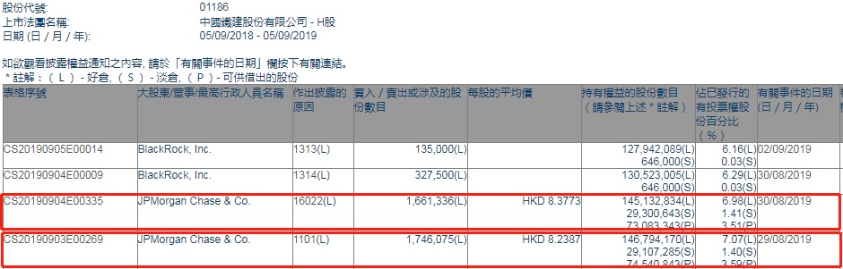 智通财经APP获悉,联交所最新资料显示,摩根大通在8月29日,8月30日连续增持中国铁建(01186)174.6075万股及166.1336万股,每股作价分别为8.2387港元及8.3773港元,总金额约为2830.29万港元。增持后最新持股数目约为1.45亿股,最新持股比例为6.98%。