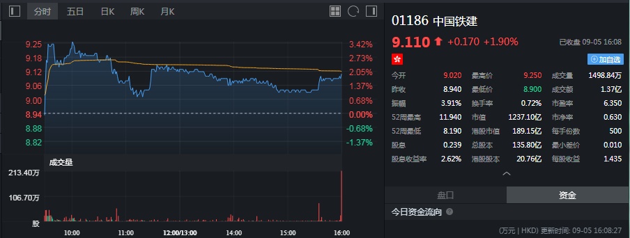 截止今日收盘,中国铁建能涨1.90%,报9.11港元。