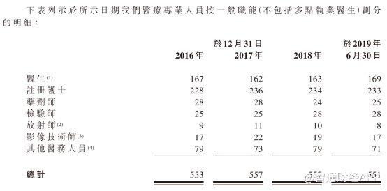 就公司专业人员配备来看,公司各职能人员数量(不包括多点执业医生)保持稳定。其中,公司医生数量增长至169名。截至2019年6月30日,公司各级别医生人数分布如下: