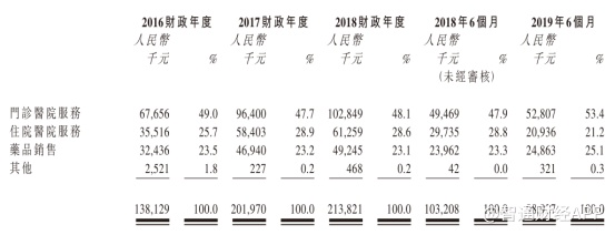 从收入类型来看,门诊医院服务为公司目前最大的收入来源。截至2016-2018年度及2019年6月30日止六个月,公司门诊医院服务收入增速分别达42.49%、6.69%、6.75%。其中,截至2019年6月30日,公司门诊医院服务、住院医院服务、药品销售收入同比增速分别为6.75%、-29.59%、3.76%。