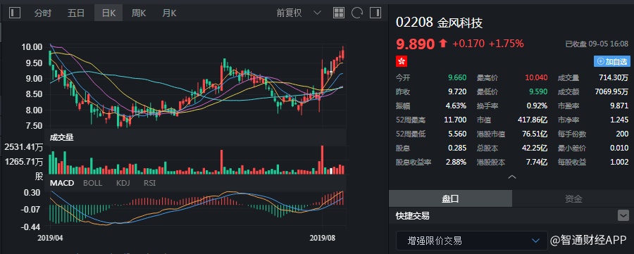 截至今日收盘,金风科技(02208) 涨1.75%,报9.89港元。