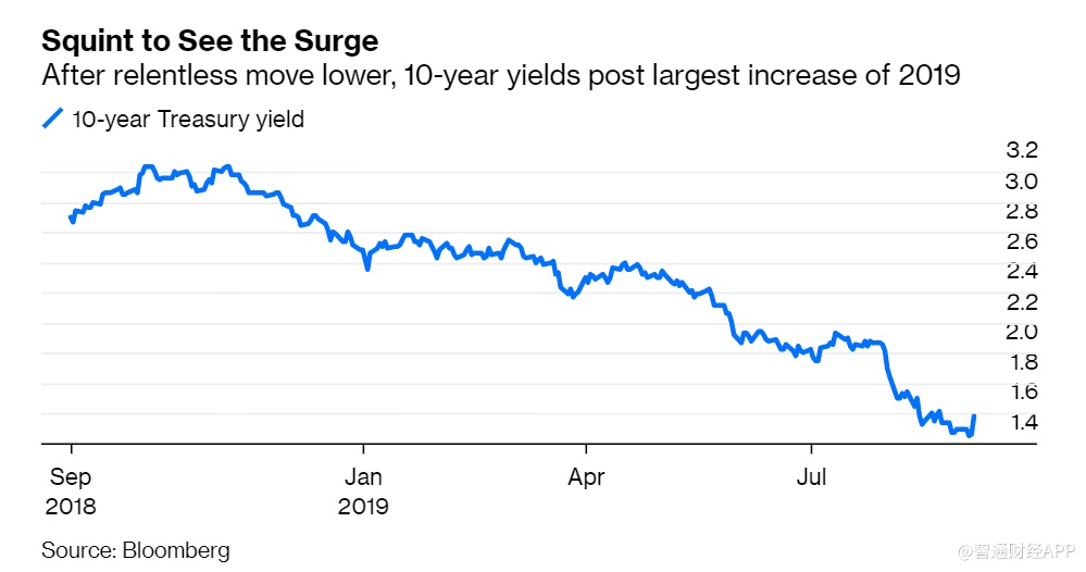 周四,有“小非农”之称的美国ADP就业人数8月增加19.5万人,增幅创四个月高位。随之而来的是美国10年期国债收益率的暴涨,美股盘中,该收益率上涨几乎12个基点,刷新8月23日以来盘中高位至1.5806%,也是自2016年11月以来的最大盘中涨幅。