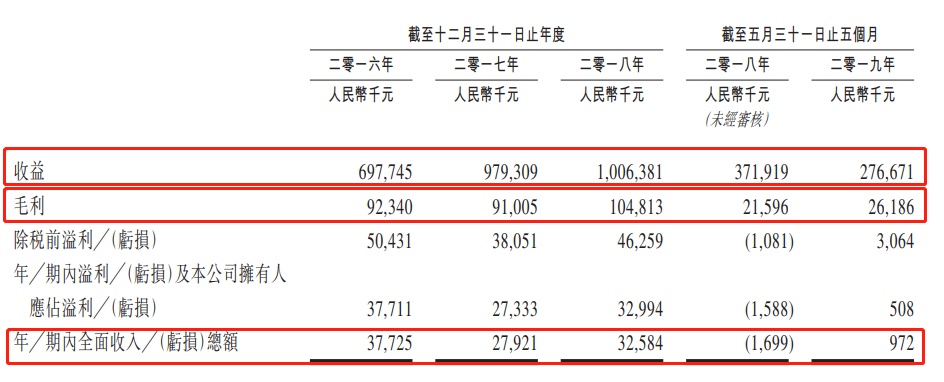 招股书显示,2016财年、2017财年及2018财年三个财年公司总收益分别为6.98亿元(人民币.下同)、9.79亿元、10亿元,逐年递增;毛利分别为9234.0万元、9100.5万元、1.05亿元;净利分别为3772.5万元、2792.1万元、3258.4万元。