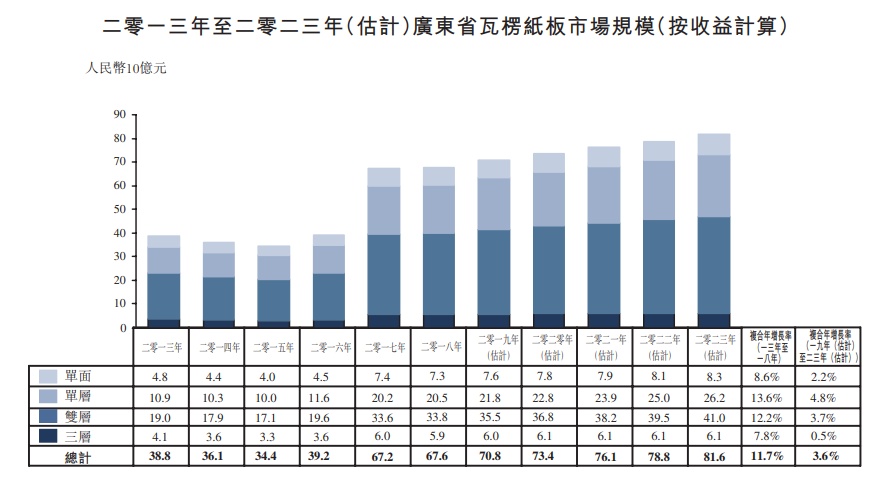 于业绩记录期间,公司和超过650名客户建立牢固的合作关系,一般为各类消费品(如电器、食品、印刷材料、家具、玩具及金属零件)的纸质包装材料制造商。公司共有七条生产线,当中的五条及两条可生产最高纸宽为1.8米及2.8米的瓦楞纸板。2018年,公司生产线年产能约为399.5百万平方米。