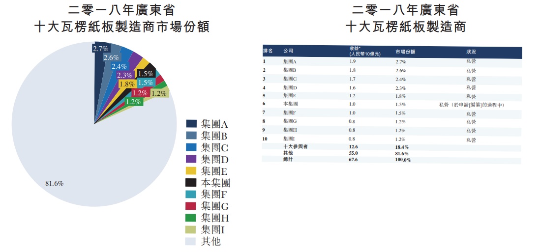 天晟集团是广东省的瓦楞纸板制造商,于2011年5月开始生产。根据行业报告,中国广东省的整体瓦楞纸板市场高度分散,2018年,广东省瓦楞纸板市场的总市场规模约为人民币676亿元,10大市场参与者主导总市场规模约18.4%,而余下市场参与者均为中小规模的市场参与者,占总市场规模的余下81.6%。2018年,公司是广东省的六大瓦楞纸板制造商之一,市场份额为1.5%。