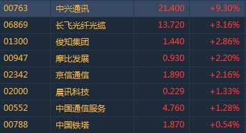 智通财经APP获悉,市场憧憬贸易磋商趋乐观,5G概念全线走高,中兴通讯(00763)领涨板块。截至9时50分,中兴通讯涨9.3%,报价21.4港元,长飞光纤(06869)涨3.16%,俊知集团(01300)涨2.86%,京信通信(02342)涨2.16%。