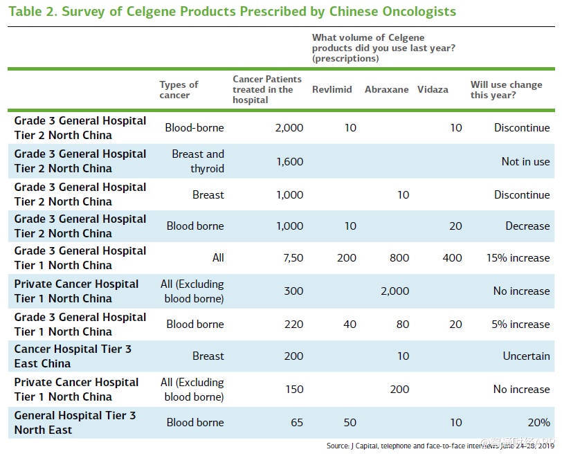 我们对中国10家主要医院的癌症医生进行的调查支持我们的观点,即Celgene对中国患者的药物销售情况低于百济神州所说的,并且增长速度更慢。该药物销售仅限于一线和少数二线城市的大医院,因为消费者可以负担得起价格更高的药物。在二线城市,医生们认为国产药品也一样好,价格比国外同类药品低80%。即使在一线城市,销售增长也很难超过10%,而在二线城市,我们根本看不到多大的增长潜力。