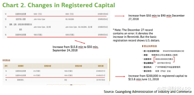 奇怪的是,这家空壳母公司的注册资本从2018年6月11日的20万美元增至1580万美元,9月24日增至5000万美元,12月27日增至9000万美元。如果公司没有产生收入,则需要使用资本金来买东西。上述每一次资本金增长都恰好发生在季度末之前,将为该公司提供足够的资金以增加库存。