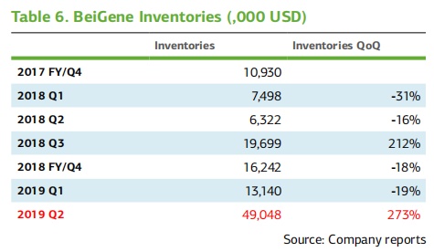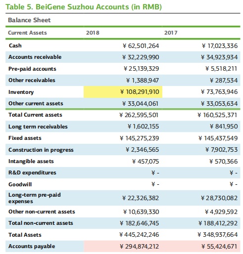 根据账目以及我们的采访,上述库存最终流入了百济神州的苏州子公司。截至2018年底,其苏州子公司的库存记录为1590万美元。正入百济神州在2018年公布的报告中所述,“截至2018年及2017年12月31日,公司的库存余额分别为16242美元和10930美元,全部是从Celgene处购买的用于在中国分销的成品。”(2018年10-K报告中第29页)基于我们的采访,我们确信其苏州子公司所拥有的库存是Celgene的产品,这意味着它必须从中国经销商处购回。