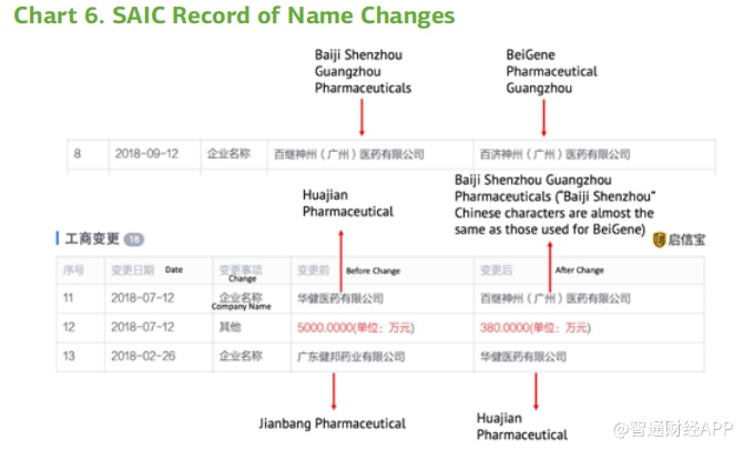 BPG在6个月内三次更名,我们认为这一策略可能是为了欺骗审计人员,让他们认为Celgene产品的买家与百济神州收购的公司不同。直到2018年2月26日,BPG被称为广东健邦药业有限公司。健邦随后更名为华健医药有限公司。7月12日,该公司再次更名为“百继神州(广州)医药有限公司”。在汉字中,只有一个字不同。