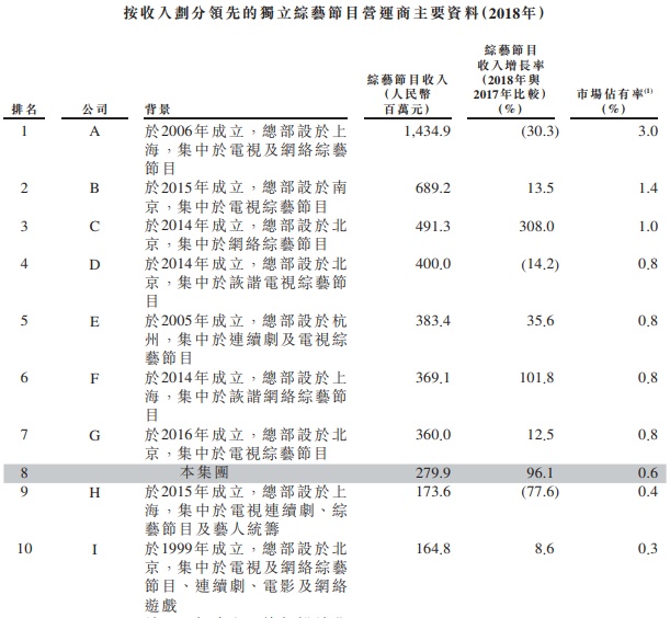 国内综艺节目运营商主要分三类:独立综艺节目运营商、电视网络内部视频内容制作团队和网上视频平台内部视频内容制作团队,煜盛文化属于第一类。中国的综艺节目市场竞争激烈且分散,有超过18,000间公司获准经营。根据煜盛文化的招股书披露,行业前十加起来的市场份额也不过是9.9%,煜盛文化在其中排名第八。虽然该行业分散,但是龙头效应依然明显,排名第一的公司在2018年收入下降30.3%的情况下,收入依然是第二名的2倍多。