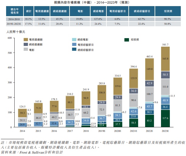 可能在很多人的印象中,网络综艺节目已经成为主流,毕竟一些如《奇葩说》之类的热门网络综艺节目在年轻人中有不错的口碑。不过根据Frost&Sullivan提供的数据,电视综艺节目依然是该细分行业的主流,2018年电视综艺产生的收入是网络综艺的2.45倍。虽然网络综艺增速快得多,但是至2023年,电视综艺产生的收入依然比网络综艺要多。