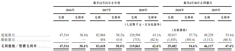 从上表可以发现,该公司的毛利率波动比较大,2016年毛利率不足40%,到了2019年止四个月,毛利率提升至53.4%,这是因为煜盛文化收入结构发生了变化。煜盛文化的收入主要来自媒体平台和企业赞助商,来自媒体平台的收入主要是分发渠道的广告费分成和节目制作费,企业赞助商则主要是在节目中给指定产品植入广告收到的广告费。