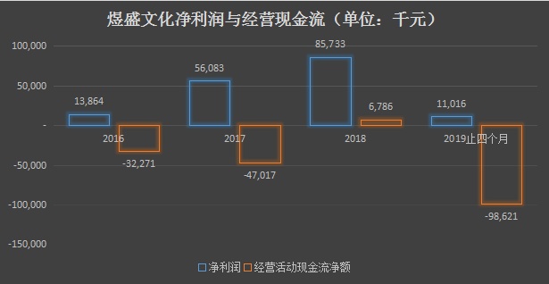 从上表可以看出,2018年新增应收款7036万元,占了2018年收入的25%,而2017年新增应收款是2415万元,占2017年收入15%。会形成这样的差异主要因为煜盛文化的收入是按节目播出或者母片交付成功来确认的,但是实际上平台并不会马上付款。这自然导致煜盛文化的现金流不好看,根据招股书的披露,煜盛文化2016年和2017年的经营活动现金流净额都为负,2018年也仅为678.6万元,要知道,当年净利润为8573.3万元。