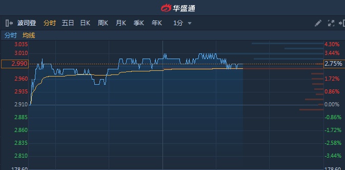 智通财经APP获悉,获纳入恒生综合大中型股指数今日盘后生效,受此消息刺激助力股价,波司登(03998)盘中高见3.01港元,创9年新高。截至14时28分,涨2.75%,报价2.99港元,成交额8023万。