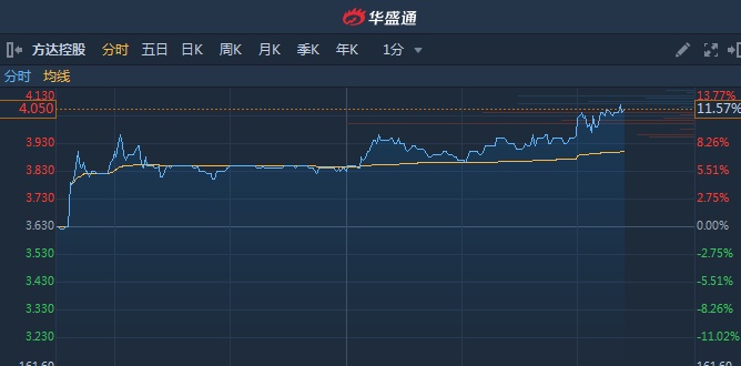 智通财经APP获悉,市场憧憬方达控股(01521)纳入港股通,该股午后放量涨幅扩大。截至15时23分,涨11.57%,报价4.05港元,成交额9140万。值得注意的是,该股盘中高见4.08港元,创历史新高。