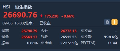 智通财经APP获悉,恒生指数开盘涨0.97%,全天窄幅震荡。截至收盘,恒生指数涨175.23点或0.66%,报26690.76点,全日成交额达998.65亿。国企指数涨0.45%,报10430.67点,红筹指数涨0.11%,报4230.34点。