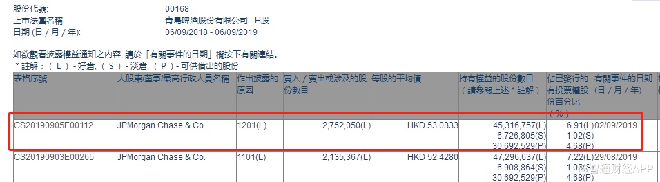 智通财经APP获悉,联交所最新资料显示,9月2日,摩根大通减持青岛啤酒(00168)275.205万股,每股作价53.0333港元,总金额约为 1.46亿港元。减持后最新持股数目约为4531.6757万股,最新持股比例为6.91%。