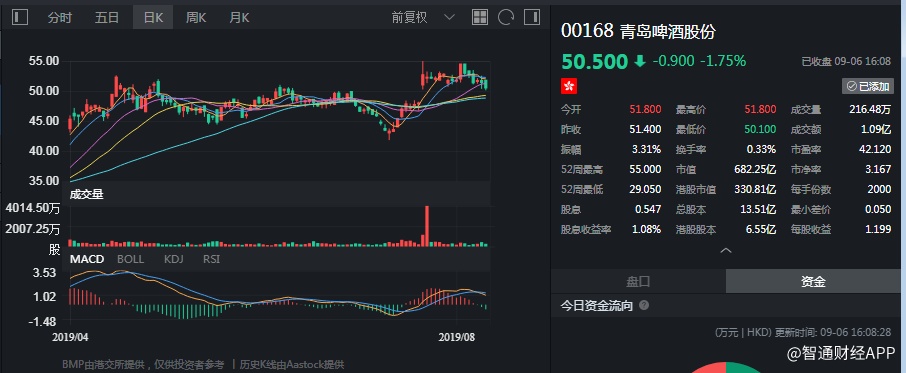 截至今日收盘,青岛啤酒(00168) 跌1.75%,报50.5港元。