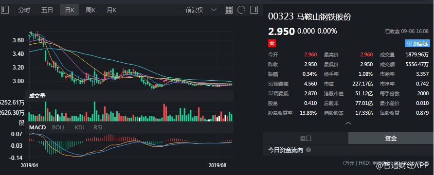 截至今日收盘,马钢股份(00323)无涨跌,报2.95港元。