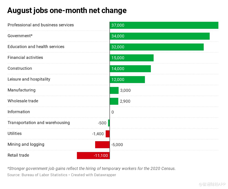 劳工部在一份新闻稿中表示:“8月份,联邦政府的就业人数上升,主要是因为2020年人口普查中雇用临时工。私营部门的就业人数总共增加了9万6千人,其中医疗保健和金融活动的就业人数显着增加但采矿业岗位减少。”
