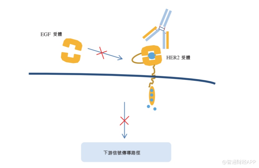 该药物的作用机理在于阻断细胞表面的HER2受体接受外界信号,从而阻止或减缓细胞增长,从而达到抑制肿瘤的作用。