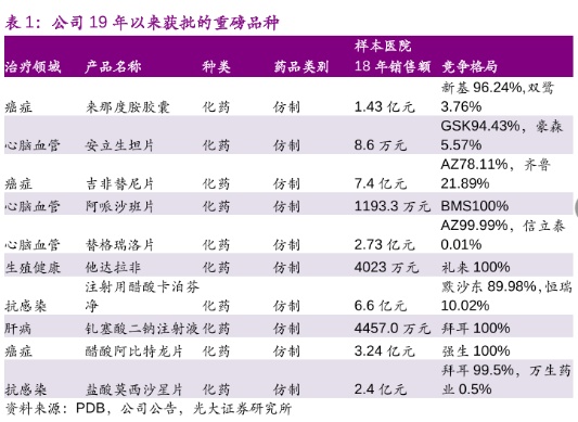 创仿并重战略助力捷报频传,重磅产品陆续上市。公司是国内医药公司研发标杆之一,19H1研发费用占收入比重高达13%。公司已构建起抗肿瘤、镇痛、生物药等八大研发平台。今年以来,公司创仿并重的战略成效显著,捷报频传,重磅产品吉非替尼、安立生坦片、阿哌沙班、他达拉非、替格瑞洛等陆续获批;布地奈德、重组人凝血因子VIII、PD-1单抗等有望于19~21年获批。公司潜力品种众多,预计19~21年每年有望上市超过10个新产品。