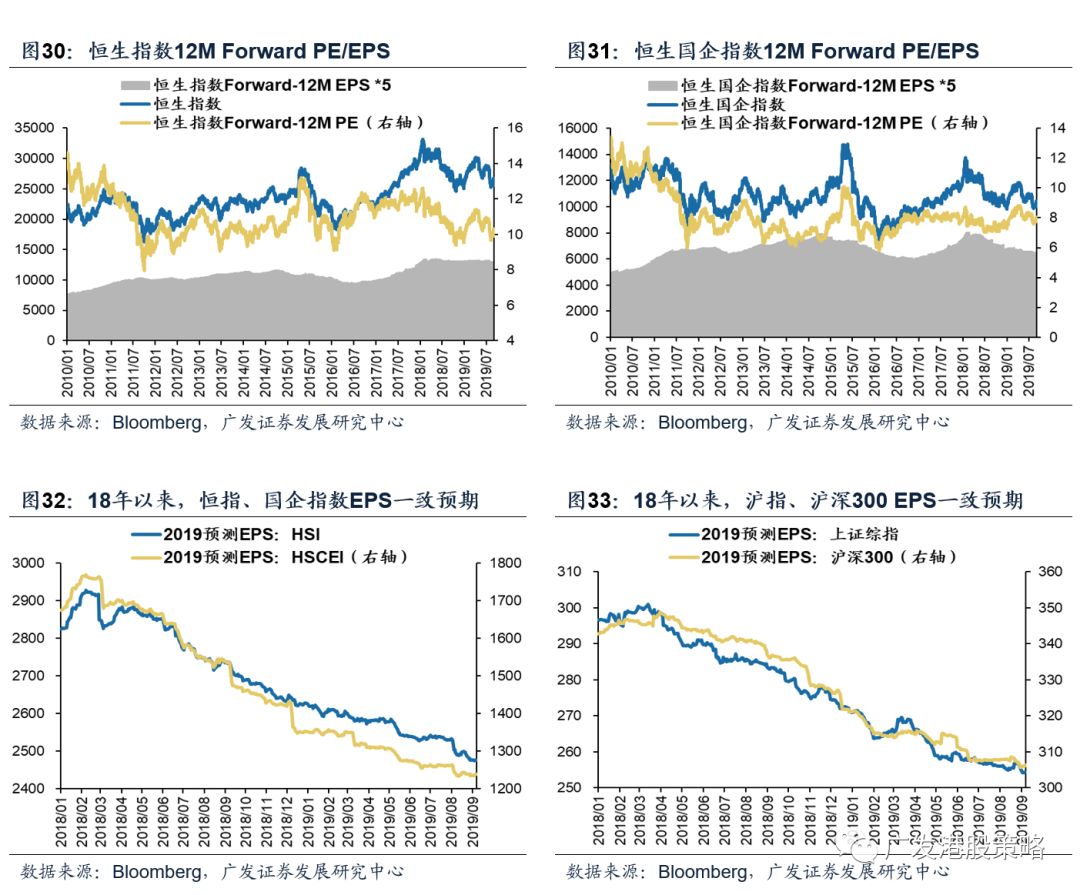 8月份以来,在恒指跌破25000之际,我们通过回溯港股长周期估值的“钟摆运动”和“均值回归”,坚定了长期能够获得可观复合回报(6%-10%)的信心。中短期而言,市场核心矛盾在于:业绩能否企稳?情绪能否回暖?资金能否回流?关于业绩,我们已于本周中报专题中全面阐述,而对于市场情绪面和资金面的变化,我们的结论如下:第一,市场面的变化:最差的时点或已过去,进入“进退自如”的布局窗口。我们认为,导致7月下旬以来港股大跌的“三大利空”边际缓和:1)7月FOMC宣布降息但表态偏“鹰”,但未来联储降息且继续偏“鸽”的可能性增加;2)本周中美贸易局势有所缓和,离岸人民币汇率升至7.1附近;3)近期市场对社会事件的预期出现改善,本地股止跌。第二,资金面的拆解:长线资产配置角度,港股的吸引力显著提升。本地资金、外资、南下资金是影响港股市场资金面走势的“三驾马车”,资金面流出的压力有所缓和:1)8月份以来南下资金流入的趋势“有增无减”,AH溢价走高、股息率高于长端利率的性价比优势凸显;2)港股“极低的估值对应极高的风险溢价”,对于配置型外资吸引力提升,且恒指的动态股息率已能满足海外养老金的回报率要求;而在10年期美债利率逼近1.5%、离岸人民币汇率反弹、恒指波动率小幅下行之际,套利型外资或出现阶段性回流;3)本地社会事件尚有余波,但对本地资金流出的冲击或阶段性缓和,且本地股快速下降的PB估值也隐含了较为悲观的预期,后续资金流出可能趋缓。市场策略:中期内,我们继续看好香港中资股“盈利稳、估值升”带来的市场机会,当前港股PB估值降至历史低位,股息率位于历史高位,凸显配置价值;短期内,市场走势同时受到香港本地事件、中美贸易变数、联储降息节奏、人民币贬值等因素的影响,在经历近期快速下跌后,下行风险有所释放。板块配置:在中美贸易基准情形下,配置“攻守兼备”,下半年关注“确定性”主线,如消费(食品、运动服饰、地产、汽车)、医疗、保险、博彩、港股自主可控科技龙头、高股息率蓝筹个股。短期而言,维持防御类配置的同时,如保险、医药、中资高股息板块等,关注部分超跌低估值板块的反弹机会,如汽车、澳门博彩、地产等。市场概览与情绪跟踪:本周(9.2-9.6)恒生指数上涨3.76%,板块方面,恒生一级行业除公用事业外全部上涨,资讯科技业涨幅最大。HVIX指数、主板沽空比例、港股看跌看涨期权比例较上周均出现下降。宏观流动性与估值跟踪:本周(9.2-9.6)人民币兑美元汇率保持稳定,10年期美债收益率小幅上涨至1.56%,中美利差小幅收窄至147BP。WTI原油价格56.2美元/桶。恒生指数PE 9.63倍,低于历史均值。一致预期EPS跟踪:本周(9.2-9.6)彭博对于恒生指数与国企指数19年EPS增速一致预期小幅上调。