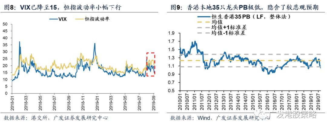市场面的变化:最差的时点或已过去。7月下旬以来港股的“三大利空”边际缓和:1)7月FOMC宣布降息但表态偏“鹰”,但未来联储继续偏“鸽”的可能性增加;2)本周中美贸易局势有所缓和,离岸人民币汇率升至7.1附近;3)近期市场对社会事件的预期出现改善,本地股止跌。