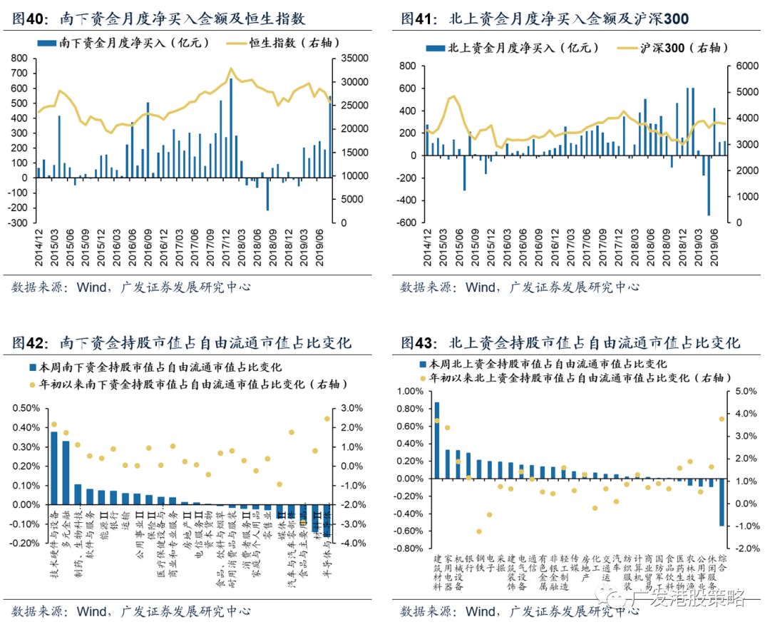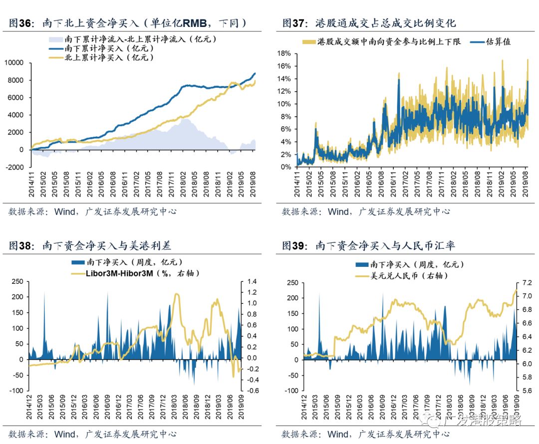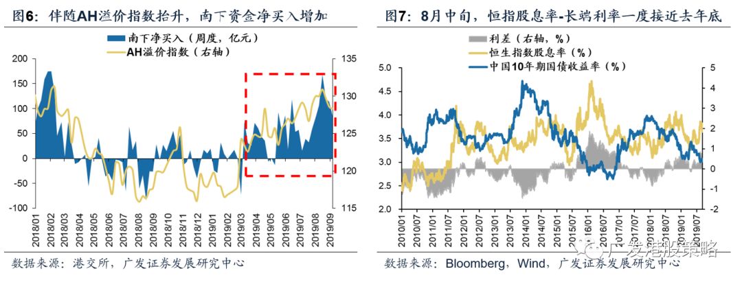 1.1 市场面的变化:最差的时点或已过去,进入“进退自如”的布局窗口一份表现好于预期的中报“大考”成绩单,已经证伪了港股盈利走弱的假设,港股至少在基本面层面存在着较强支撑(参考报告《“基本盘”显韧性,早周期待蓄势——2019年港股中报业绩深度专题》,2019-9-5)。除此之外,导致7月下旬以来港股大跌的“三大利空”边际缓和,市场情绪从“暂避锋芒”到“进退自如”:第一,7月FOMC宣布降息但表态偏“鹰”,但随着美国PMI数据下行、利差倒挂加剧,联储降息且继续偏“鸽”的可能性增加。最新市场预期联储9月降息概率100%、年内降息3次概率接近40%;第二,8月初中美贸易冲突加剧,美元兑离岸人民币破“7”至7.2,使得外资加速流出港股市场;而本周中美贸易局势有所缓和,离岸人民币汇率升至7.1附近;第三,7月底至8月上旬本地社会事件持续升级,但近期市场对此预期出现改善(参考报告《港股大涨背后:价值坚守的回馈》,2019-9-4),推动本地资金回流。再者,“锦上添花”的是国内“稳增长”政策的加码——7月底以来国内逆周期对冲力度不断加码,政治局会议、金稳会、国常会等一系列重大会议强化落实“稳增长”和“逆周期”对冲政策。而本周央行决定于9月16日全面降准0.5个百分点,另外对仅在省级行政区内经营的城商行定向降准1个百分点,共计释放9000亿流动性;加上后续可能的降息(MLF利率下调),预计将推动实体融资成本走低,提高中资股盈利弹性。1.2 资金面的拆解:长线资产配置角度,港股的吸引力显著提升从我们近期和投资者交流反馈的信息来看,出于对港股高股息、低估值、基本面稳健的考虑,部分中长期配置型资金开始重视港股的配置价值;而随着市场面“三大利空”的消散,中短期交易型资金配置港股的兴趣也在增加。对此,我们试图从资金面拆解的角度阐述该现象背后的逻辑。港股市场是机构投资者占据主导的市场,而在诸多机构性质中,香港本地机构(本地资金)、国际机构(外资)、中资机构(南下资金)是影响港股市场资金面走势的“三驾马车”。其中,本地资金和外资仍决定了港股市场走势,而南下资金伴随互联互通扩容对港股的影响力不断上升。首先,本轮港股下跌过程中,南下资金是在不断流入的,8月份以来流入的趋势“有增无减”。南下资金增配港股的逻辑非常朴素——估值的确很便宜,即使考虑静态股息率也远超资金成本。这具体体现为:1)纵向来看,港股的PE/PB/股息率均处于历史上极有吸引力的阶段;2)横向对比A股,AH溢价指数升至132,南下资金流入港股的兴趣提升;3)恒指的股息率-10年期国债收益率一度接近去年底的水平,对于南下资金吸引力较高。因此对于长线配置型的内资而言,在国内利率中枢下移的过程中,港股高股息的策略极为受用。我们在路演交流过程中,亦发现国内保险资金、银行资管子公司、公募跨AH市场配置等类型的资金对配置港股的意愿明显提升。其次,造成本轮港股大跌的主因仍是外资流出,但需要区分配置型外资和套利型外资,套利型外资对市场短期扰动较大。配置型外资在港股盈利预期稳定时,主要盯住“估值锚”,由于港股“极低的估值对应极高的风险溢价”,当估值隐含的预期回报能够满足长期收益率要求时,仍会“越跌越买”——以OECD国家5年期养老金回报衡量(3.8%),目前港股动态股息率已能满足长线配置型外资的需要;而套利型外资主要盯住人民币汇率、波动率和美债利率,在10年期美债利率逼近1.5%、离岸人民币汇率反弹、恒指波动率小幅下行之际,交易更频繁的外资或阶段性回流。再次,本地社会事件尚有余波,但对本地资金流出的冲击或阶段性缓和,且本地股快速下降的PB估值也隐含了较为悲观的预期,后续资金流出可能趋缓。