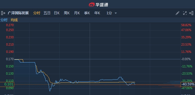 智通财经APP获悉,细价股广泽国际发展(00989)惨遭洗仓,盘中股价一度腰斩,低见0.077港元,创历史新低。截至14时29分,跌40.59%,报0.101港元,成交额594万。