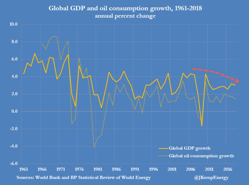 全球GDP增长推动石油消费的增长。Kemp指出,根据世界银行在2019年6月份发布的《全球经济展望》中的数据,今年世界经济增长将陷入低迷。据估计,全球GDP增速已从2018年的3%,被下调至2019年的2.6%。