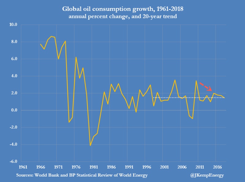 所有迹象都表明,全球经济增速将会继续放缓,未来几个季度,石油消耗的增速可能仍将低于目前趋势水平,从而压低现货价格。