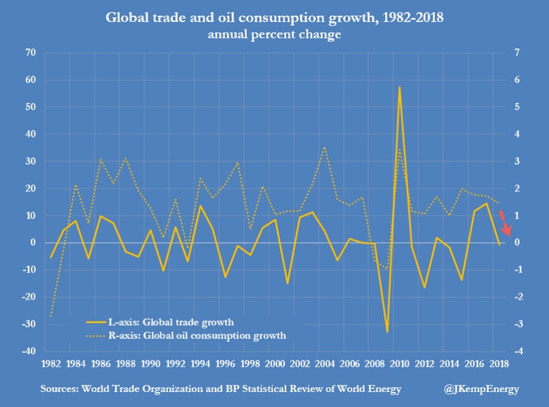 全球石油需求下降是全球制造业衰退所导致的结果。而全球同步出现衰退是结构性的,始于2017年第四季度。而在几个月后,中美贸易关系于2018年第一季度发生变化。