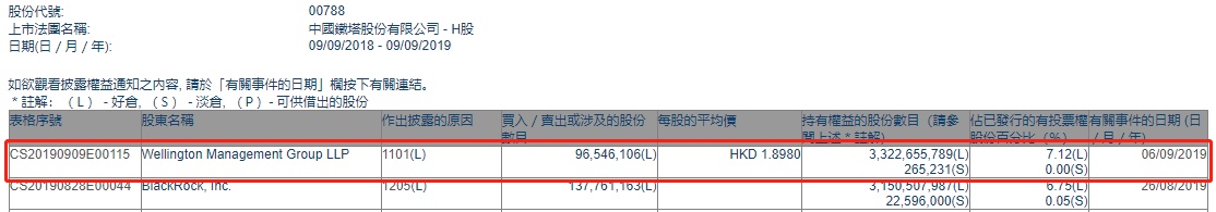 智通财经APP获悉,根据联交所资料显示,威灵顿管理公司于9月6日增持中国铁塔股份有限公司(00788)约9655万股,每股作价1.898港元,总值约1.83亿港元,最新持股数目约33.2亿股,最新持股比例为7.12%。
