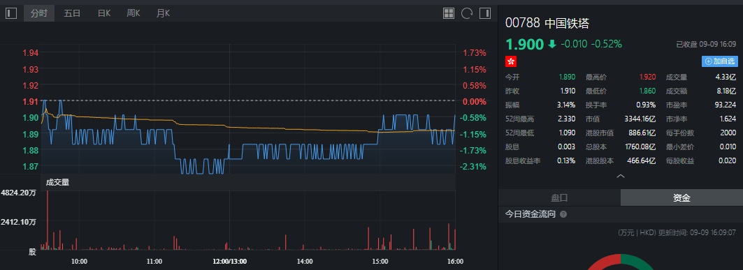 截至今日收盘,中国铁塔(00788)跌0.52%,报1.90港元。