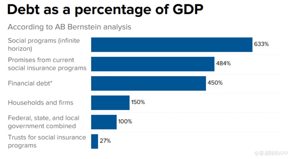 AllianceBernstein的计算方式不仅仅包括传统公共债务水平,还囊括了金融债务以及一些政府计划的社会保障项目如医疗保险以及养老金等。准确来说,美国的负债总额等于国内生产总值的18.44倍。