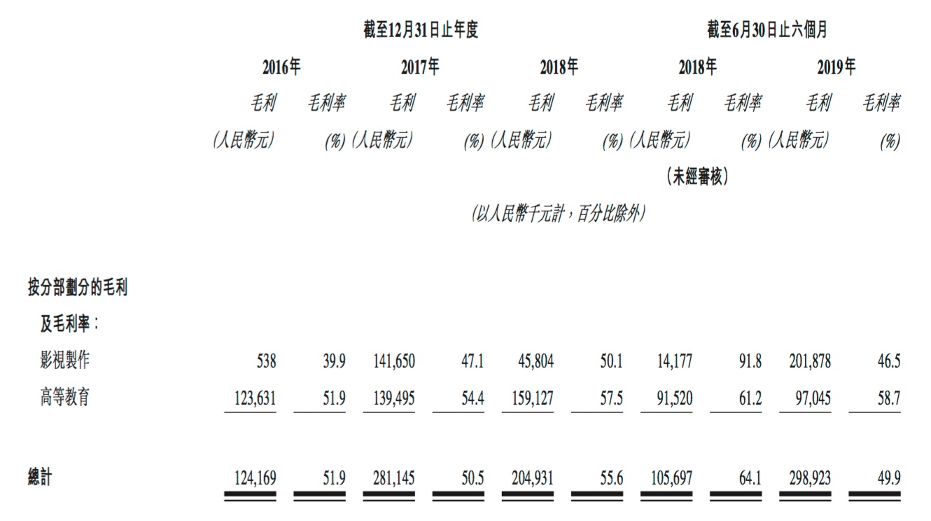 于截至2019年6月30日止六个月,华夏视听录得的总收益及利润分别为599.5百万元及245.8百万元,其中高等教育及影视制作业务分别产生收益165.4百万元及434.1百万元。