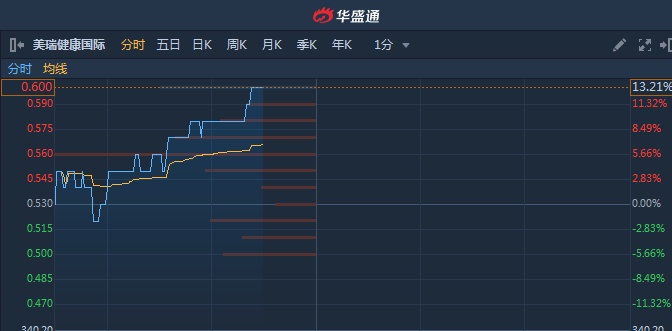 智通财经APP获悉,美瑞健康国际(02327)获主席兼执董周旭洲增持838.2万股,涉资约426万港元,截至11时28分,涨13.21%,报价0.6港元,成交额1573万。