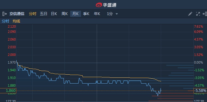 智通财经APP获悉,A股5G概念集体承压,京信通信(02342)股价高位回落。截至14时59分,跌5.58%,报价1.86港元,成交额3383万。