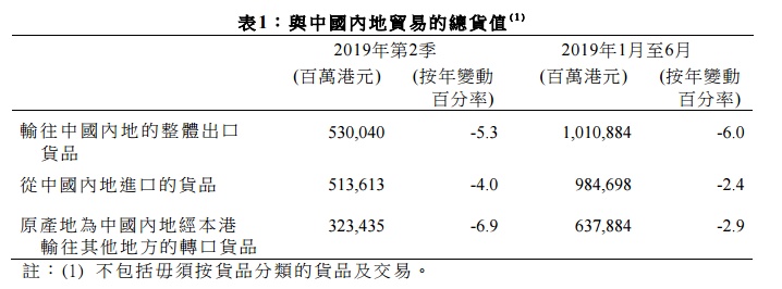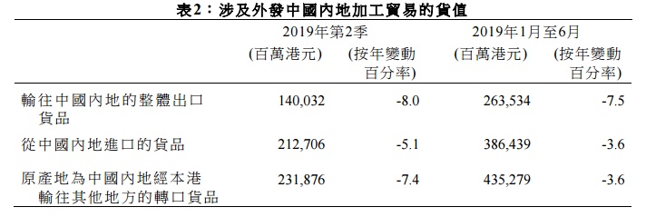 2019年上半年,输往内地的整体出口货品中,有2635亿元的货品是作外发内地加工用途,同比下跌7.5%。另一方面,从内地进口货品中有3864亿元的货品是与外发内地加工有关,同比下跌3.6%。而原产地为内地经香港输往其他地方的转口货品中,有4353亿元的货品曾经安排在内地加工制造,同比下跌3.6%。