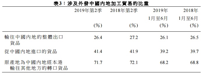 2019年上半年,输往内地的整体出口货品中有26.1%是作外发内地加工用途。另一方面,从内地进口货品中有39.2%与外发内地加工有关。同期,原产地为内地经香港输往其他地方的转口货品中,有68.2%曾经安排在内地加工制造。