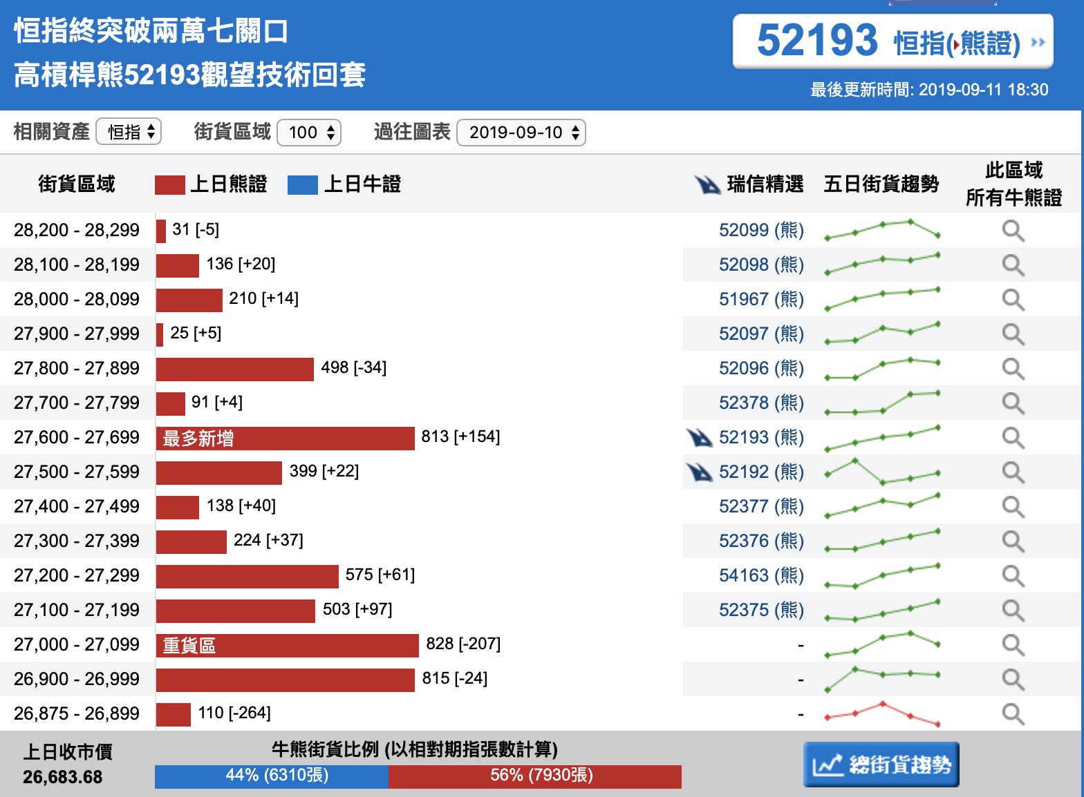 智通财经APP获悉,截至9月10日,恒指最新的牛熊街货比例44:56。瑞信恒指牛熊证街货分布图中的数据显示,熊证街货重货区在27000-27099区间,该区间最新熊证数量为828张,较上一交易日减少207张,最多新增在27600-27699区间。牛证街货重货区在25800-25899区间,该区间最新牛证数量为1158张,比上一交易日增加336张;最多新增区间在25800-25899区间。