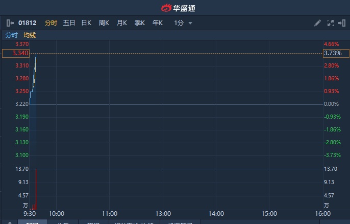 智通财经APP获悉,造纸业迎来行业旺季,全国多家纸厂陆续发布了涨价通知函。晨鸣纸业(01812)受益股价直线拉升,截至发稿,涨3.73%,报3.34港元,成交额59.29万港元。