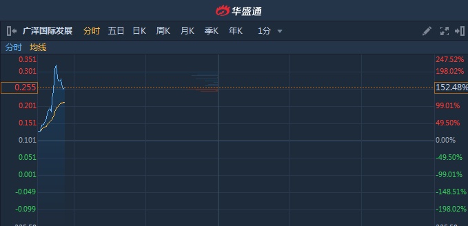 智通财经APP获悉,广泽国际发展(00989)今日复牌,股价快速拉涨,一度涨超200%,暂居涨幅榜首位,截至9时51分,涨152.48%,报价0.255港元,成交额1581万。