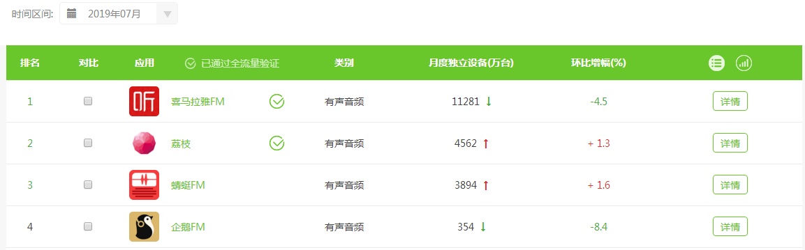 据艾瑞咨询数据显示,喜马拉雅在2019年7月的活跃用户数为1.13亿,而同期的荔枝仅有4562万,蜻蜓仅有3894万。即使荔枝与蜻蜓的月活跃用户数相加,也远低于喜马拉雅。喜马拉雅一超多强的领先格局毋庸置疑。