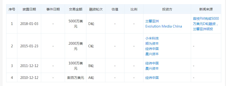 虽然荔枝成立于2013年,但其融资历史,从2010年便已开始,在荔枝FM诞生前,荔枝的前身已进行过两轮融资,均由经纬中国领投。至2015年时,荔枝进行了C轮2000万美元融资,经纬中国、晨兴资本继续跟投,小米科技、顺为资本也在其中。
