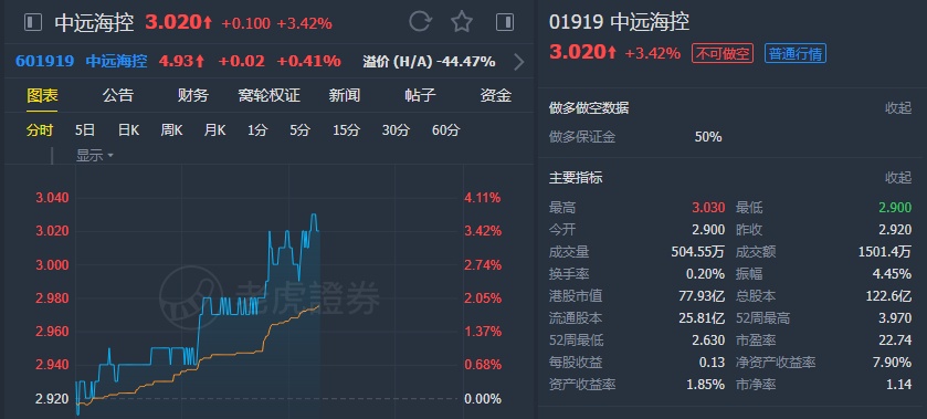 智通财经APP获悉,高盛发布报告称,中远海控(01919)目前估值已低于今年1月的低位,当时贸易关系正有松懈的迹象,该行表示,中远海控目前的估值已经反映国际洽谈会有31%机会停止,并相信中远海控目前是一个吸引的买入点,公司上半年业绩稳健,认为可以支持其价格稳定。