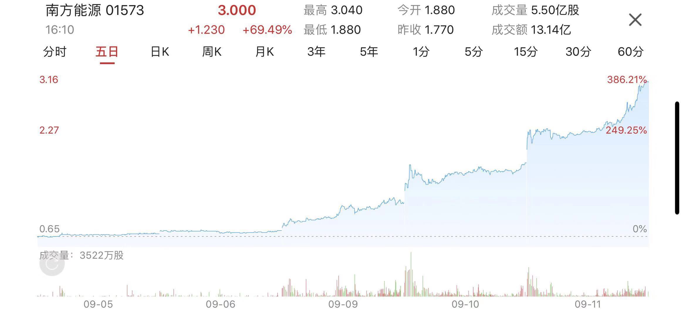 自打进入了港股通标的后,南方能源股价可谓是一骑绝尘。从9月9日最低价0.77港元算起来,三个交易日已经暴涨了近4倍,而且伴随着大成交(今日该股成交13亿港元,堪比当初的中烟香港火爆),该股的上涨势头似乎还没完结。